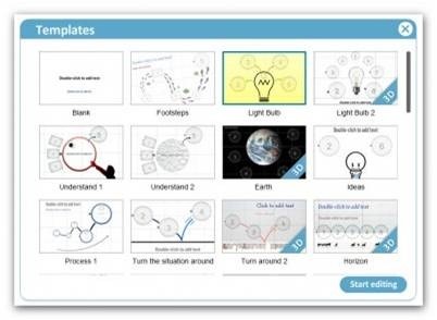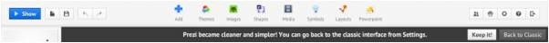«Start editing» túymesine basıń. («Redaktrlawdı baslaw»). Keyingi basqıshda biz prezentaciya interfeysi menen tanısamız. 2012 jıl oktyabr ayınan baslap jańa Prezi veb-interfeysi payda boldı. Bul qolay hám ápiwayı. Redaktordıń barlıq tiykarǵı elementleri joqarı panelge kiritilgen hám piktogramm menen suwretlengen (3-súwret).